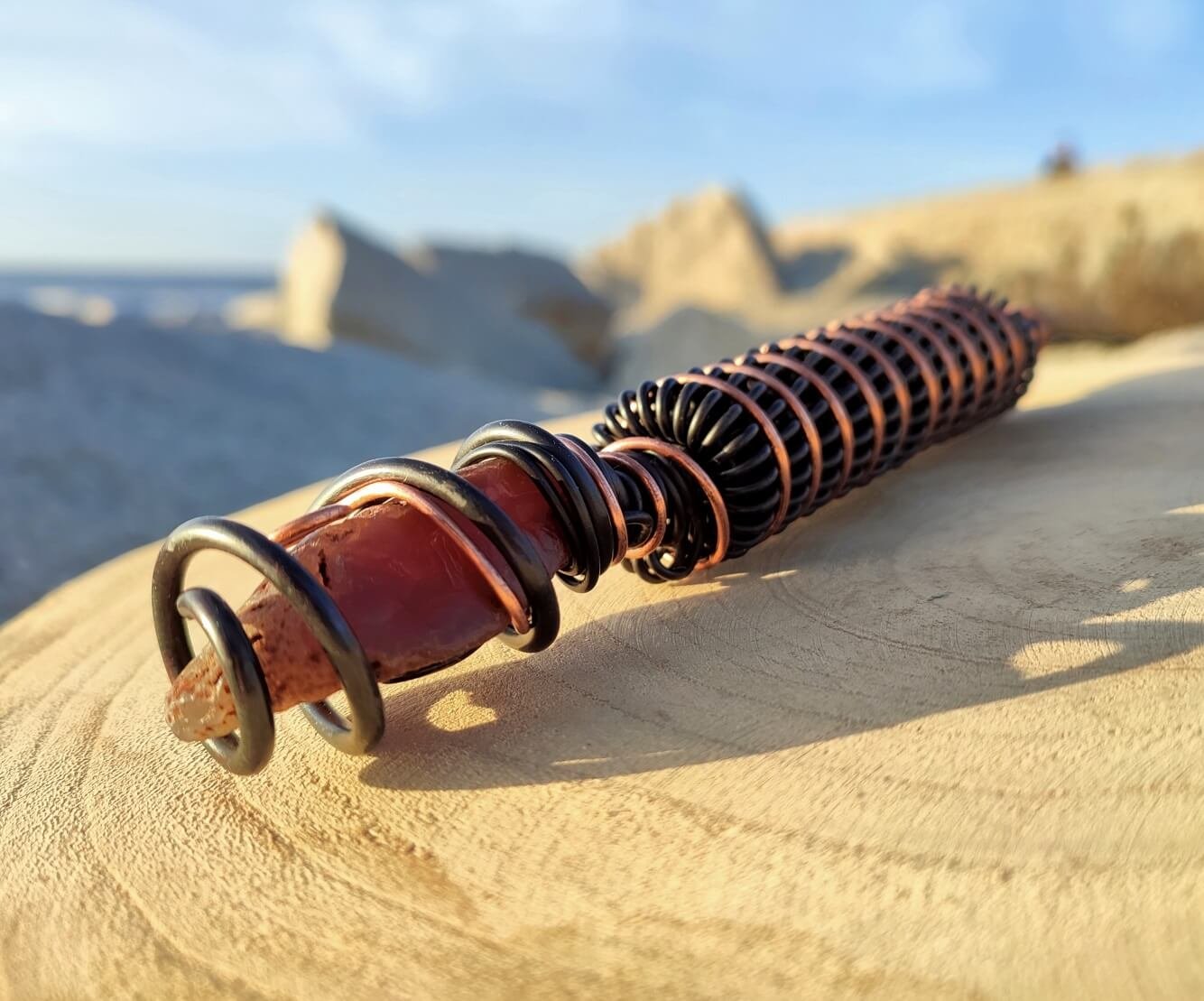 U podstawy różdżki znajduje się surowy Karneol, którego właściwości są wielokrotnie wzmacniane przez spiralną strukturę nano-miedzi. Inspiracją dla konstrukcji są odkrycia Nikoli Tesli, Keshe oraz wieloletnia praktyka pracy z energią.